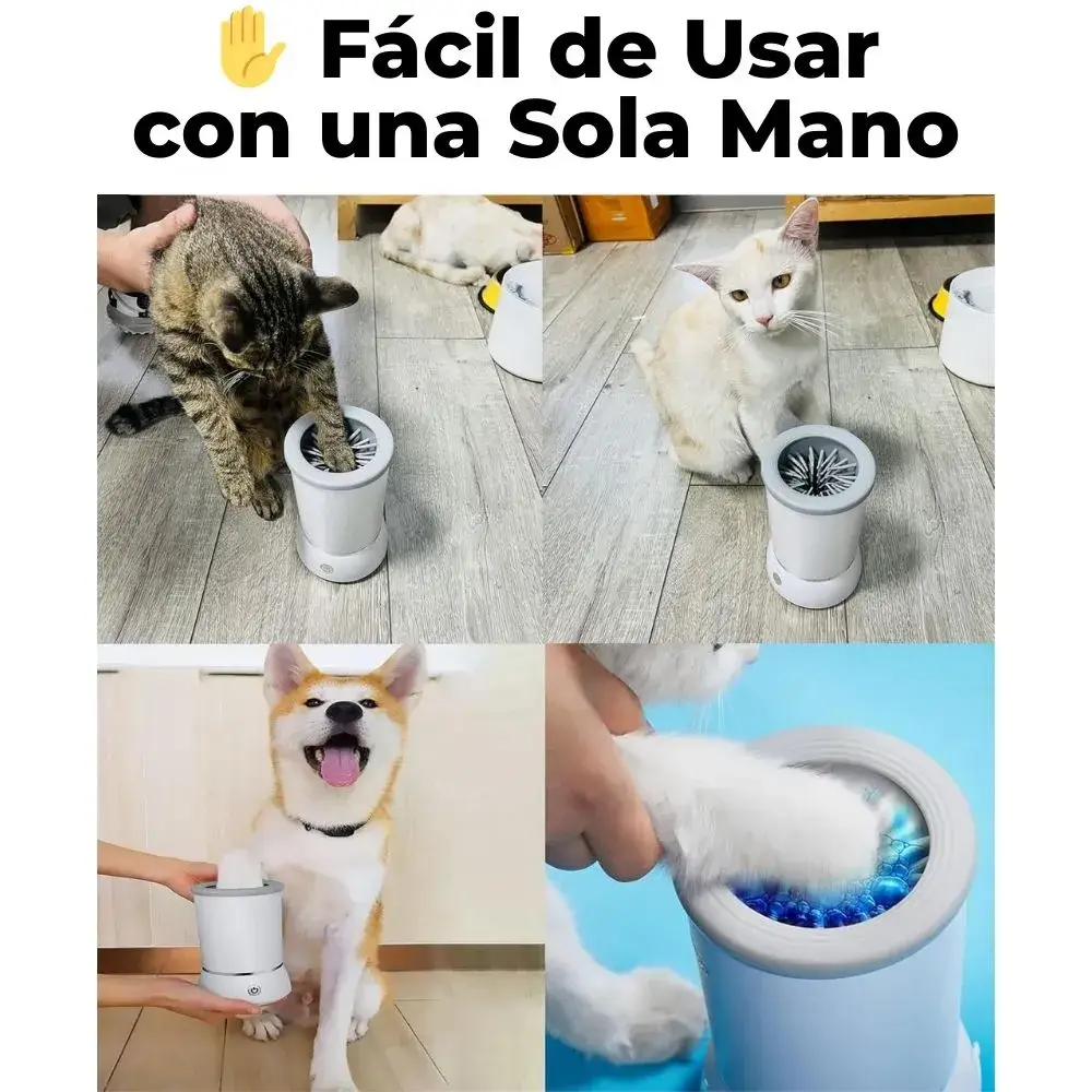 Llena con agua y opcionalmente shampoo → Inserta la pata → Presiona y limpia.